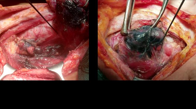 术中切除可疑组织0.2×0.2cm实体部分即刻进行病理组织活检,其余组织湿盐水纱球包裹保存,若回报为甲状旁腺组织,即刻进行甲状旁腺自体移植。